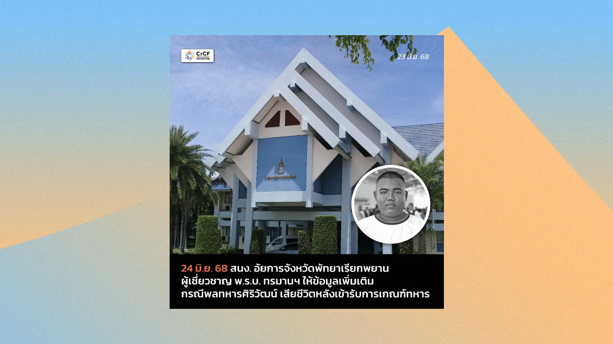 24 มิ.ย. สนง. อัยการจังหวัดพัทยาเรียก ผอ. มูลนิธิผสานวัฒนธรรม กรณีพลทหารศิริวัฒน์ เสียชีวิตหลังเข้ารับการเกณฑ์ทหาร 23 มิถุนายน, 2025