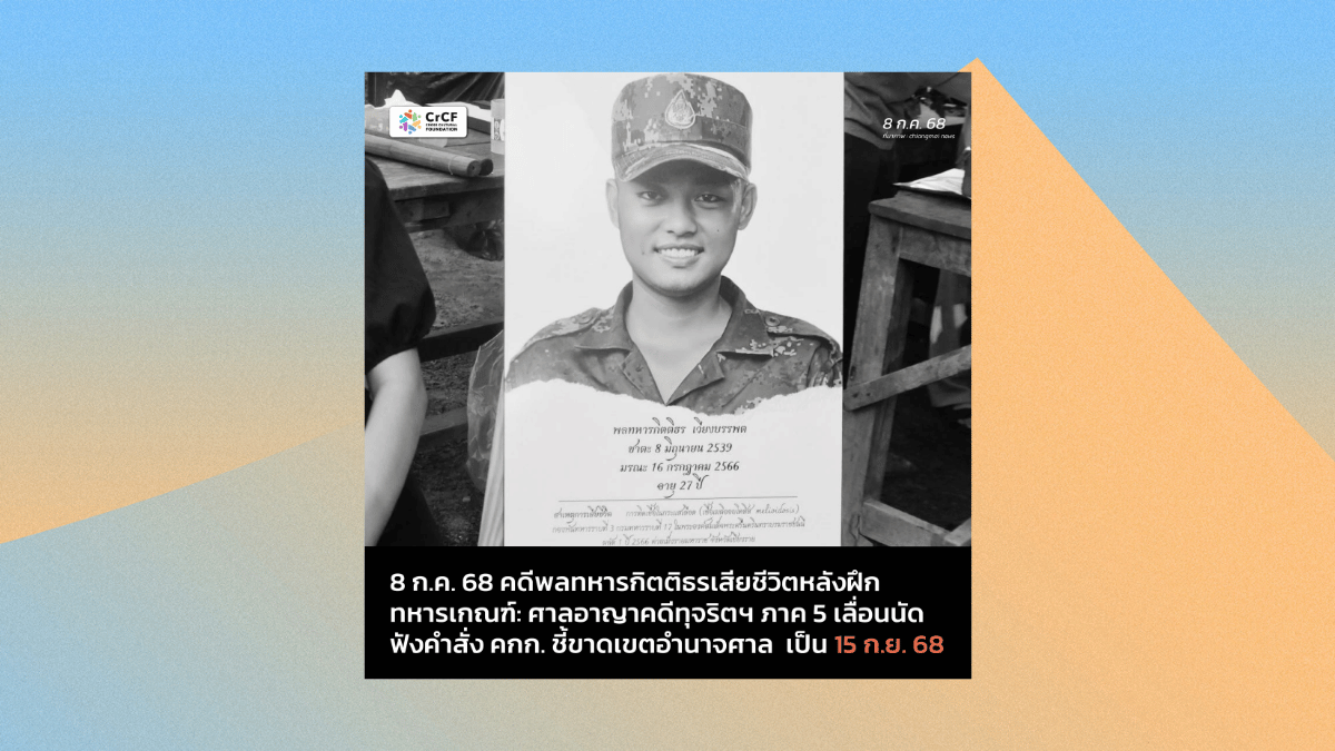 8 ก.ค. 68 คดีพลทหารกิตติธรเสียชีวิตหลังฝึกทหารเกณฑ์: ศาลเลื่อนนัดฟังคำสั่ง คกก. ชี้ขาดเขตอำนาจศาล เป็น 15 ก.ย. 68 8 กรกฎาคม, 2025
