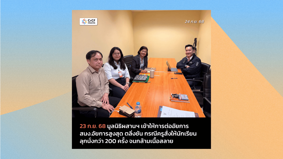 23 ก.ย. 68 มูลนิธิผสานวัฒนธรรมเข้าให้ข้อเท็จจริงต่ออัยการ สนง. อัยการสูงสุด ตลิ่งชัน กรณีครูสั่งให้นักเรียนลุกนั่งจนกล้ามเนื้อสลาย 24 กันยายน, 2025