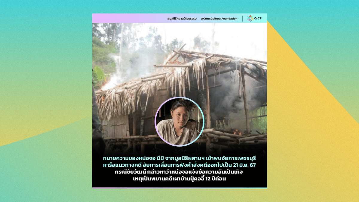 ทนายความของหน่อจอ มีมิ จากมูลนิธิผสานวัฒนธรรม เข้าพบอัยการเพชรบุรีหารือแนวทางคดี อัยการเลื่อนการฟังคำสั่งคดีออกไปเป็น 21 มิ.ย. 67 กรณีชัยวัฒน์ กล่าวหาว่าหน่อจอแจ้งข้อความอันเป็นเท็จ เหตุเป็นพยานคดีเผาบ้านปู่คออี้ 12 ปีก่อน 19 มีนาคม, 2024