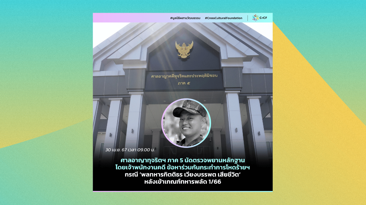 ศาลอาญาทุจริตฯ ภาค 5 นัดตรวจพยานหลักฐานโดยเจ้าพนักงานคดี ข้อหาร่วมกันกระทำการโหดร้ายฯ กรณีพลทหารกิตติธร เวียงบรรพต เสียชีวิตหลังเข้าเกณฑ์ทหารผลัด 1/66 29 เมษายน, 2024