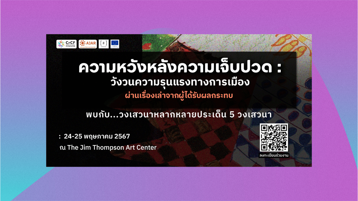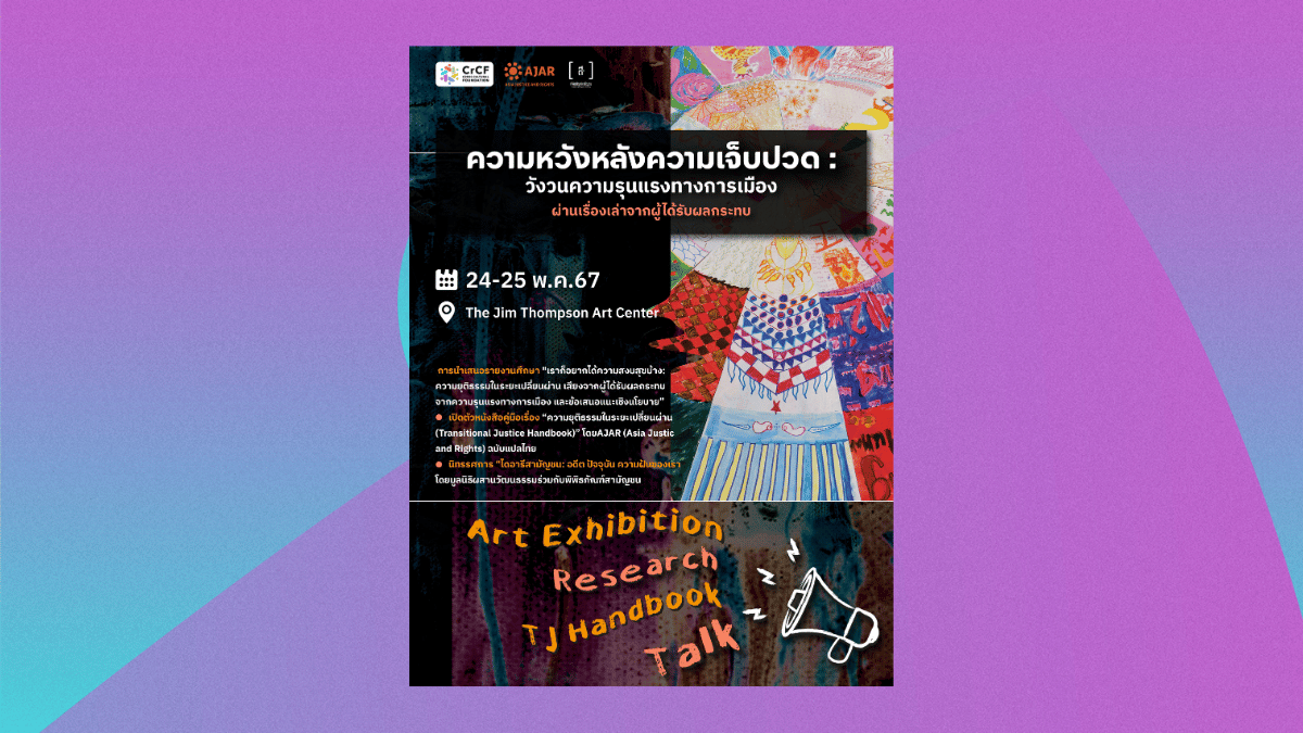 เตรียมพบกับ 1 ปาฐกถา 1นิทรรศการ 2 งานวิจัย 5 เวทีเสวนา ในงาน “ความหวังหลังความเจ็บปวด : วังวนความรุนแรงทางการเมือง ผ่านเรื่องเล่าจากผู้ได้รับผลกระทบ” 23 พฤษภาคม, 2024