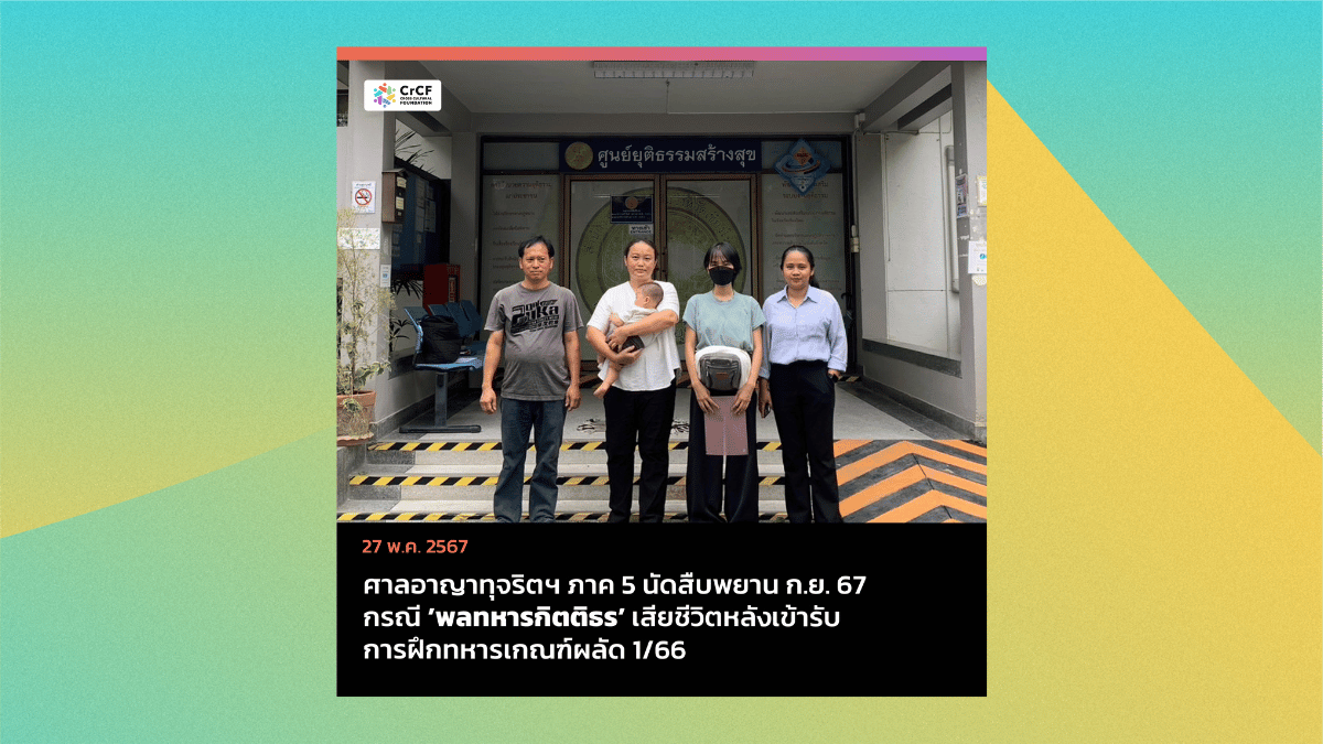 ศาลอาญาทุจริตฯ ภาค 5 นัดสืบพยาน ก.ย 67 กรณีพลทหารกิตติธร เวียงบรรพต เสียชีวิตหลังเข้ารับการฝึกทหารเกณฑ์พลัด 1/66 27 พฤษภาคม, 2024