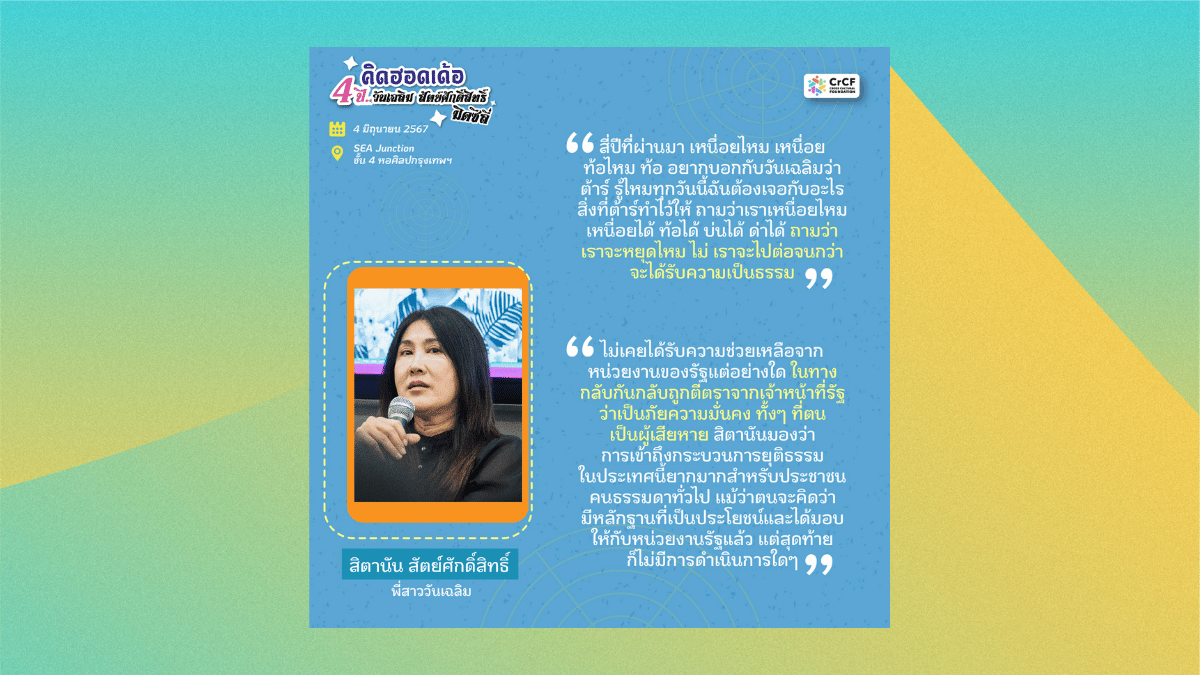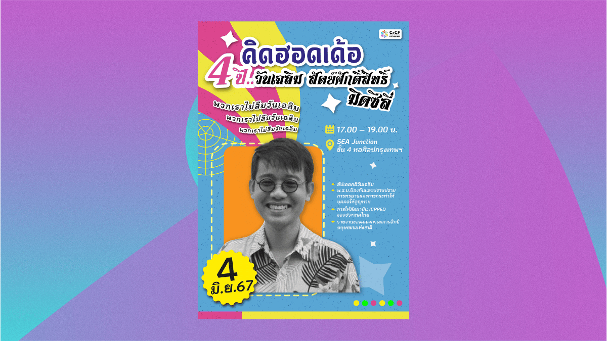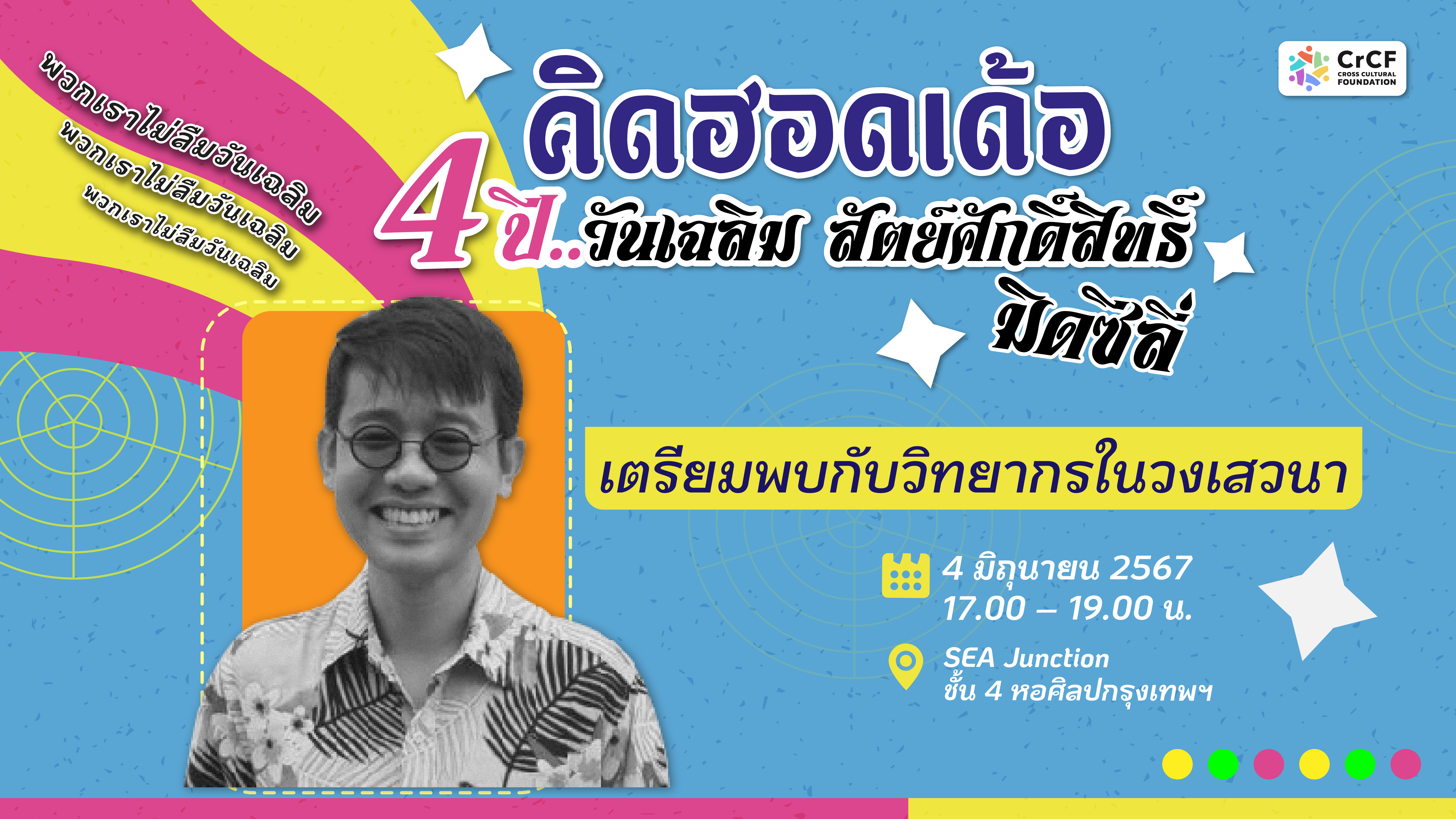 งานเสวนา “คิดฮอดเด้อ: 4 ปี วันเฉลิม สัตย์ศักดิ์สิทธิ์ มิดซีลี่” วันที่ 4 มิถุนายน 2567ที่ SEA Junction ชั้น 4 หอศิลปวัฒนธรรมแห่งกรุงเทพมหานคร (BACC) 29 พฤษภาคม, 2024