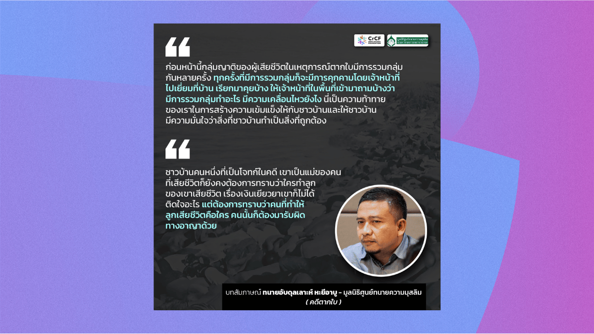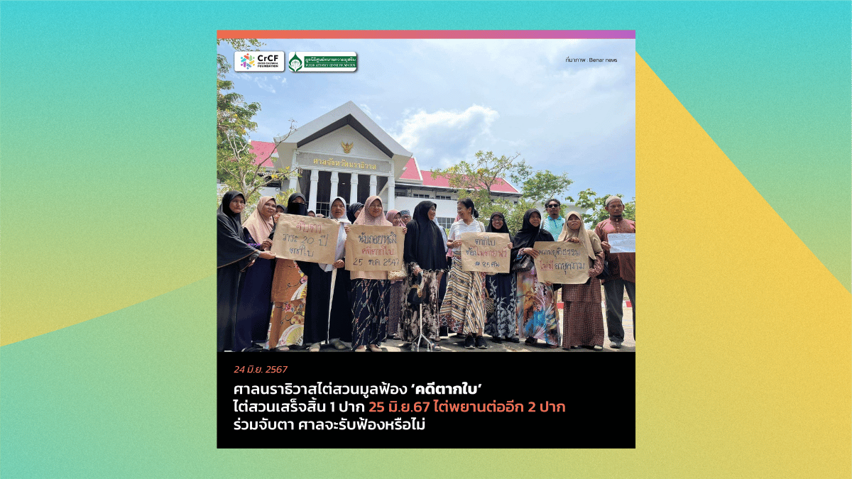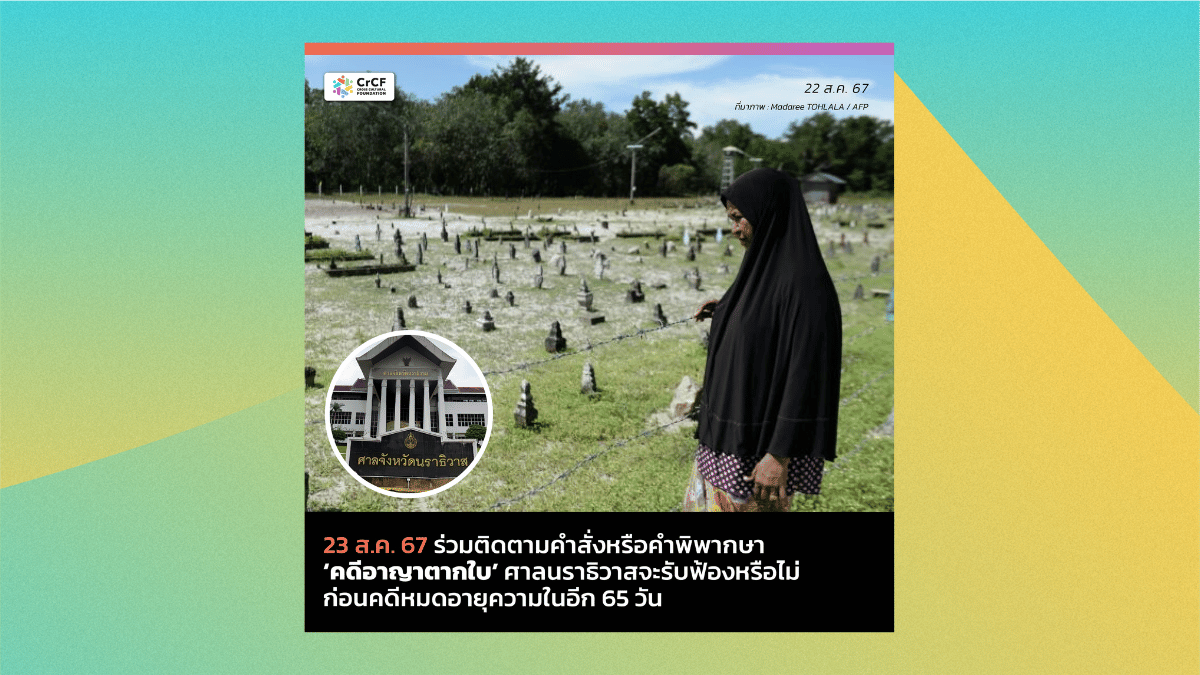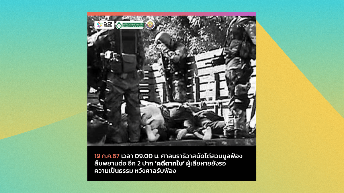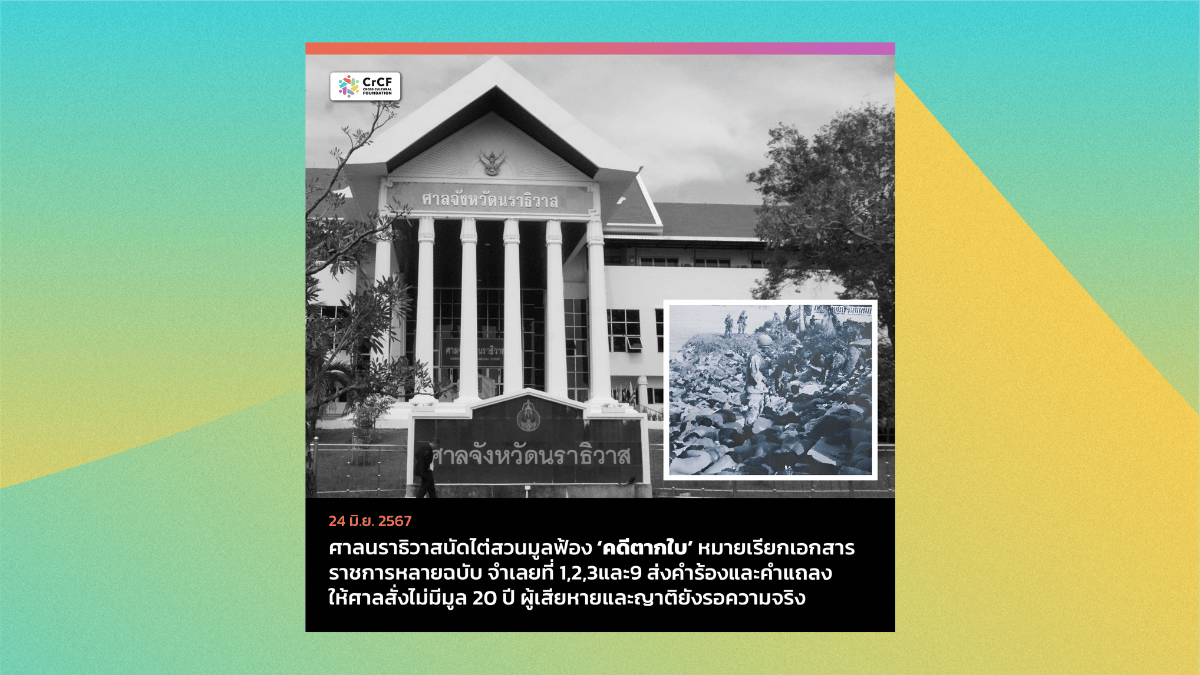 24 มิ.ย. ศาลนราธิวาสนัดไต่สวนมูลฟ้อง คดีอาญาเหตุการณ์ตากใบ หมายเรียกเอกสารราชการหลายฉบับ จำเลยที่1,2,3และ9 ส่งคำร้องและคำแถลงให้ศาลสั่งไม่มีมูล 20 ปี ผู้เสียหายและญาติยังรอความจริง ทีมทนายหวังเข้าถึงกระบวนการยุติธรรม 21 มิถุนายน, 2024