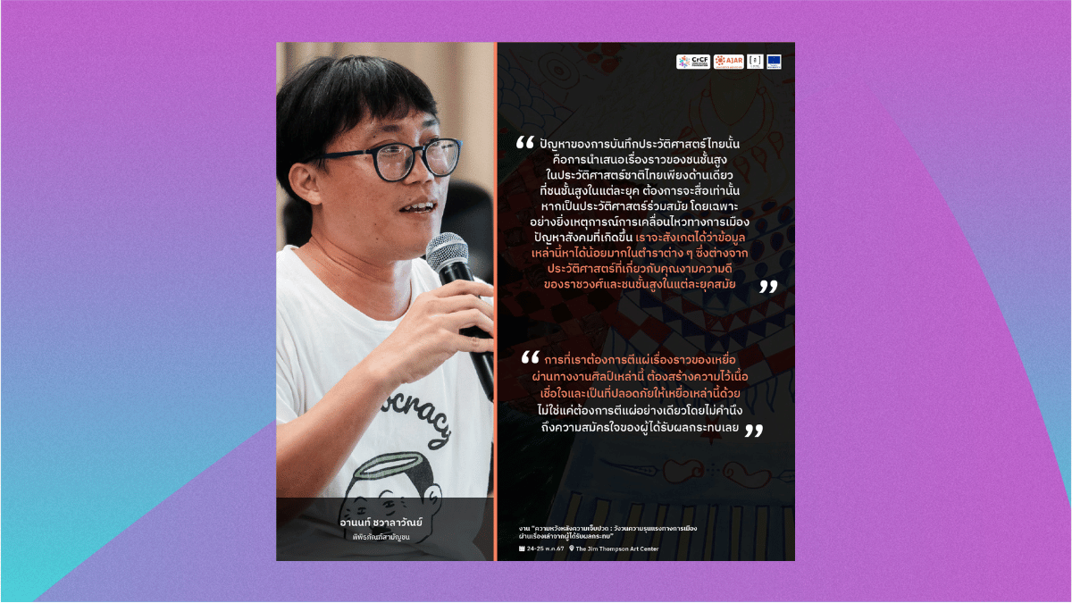 เวทีเสวนาหัวข้อ “คำบอกเล่าจากศิลปะ: ประวัติศาสตร์จากประชาชน” ภายในงาน “ความหวังหลังความเจ็บปวด : วังวนความรุนแรงทางการเมือง ผ่านเรื่องเล่าจากผู้ได้รับผลกระทบ” 31 พฤษภาคม, 2024