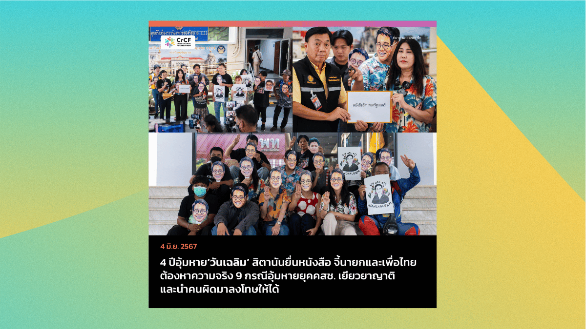 4 มิ.ย. สิตานันพี่สาววันเฉลิม ยื่นหนังสือถึงนายกเศรษฐาและพรรคเพื่อไทย ทวงถามปัญหา 9 กรณีอุ้มหายหลังรัฐประหารปี 57 30 พฤษภาคม, 2024