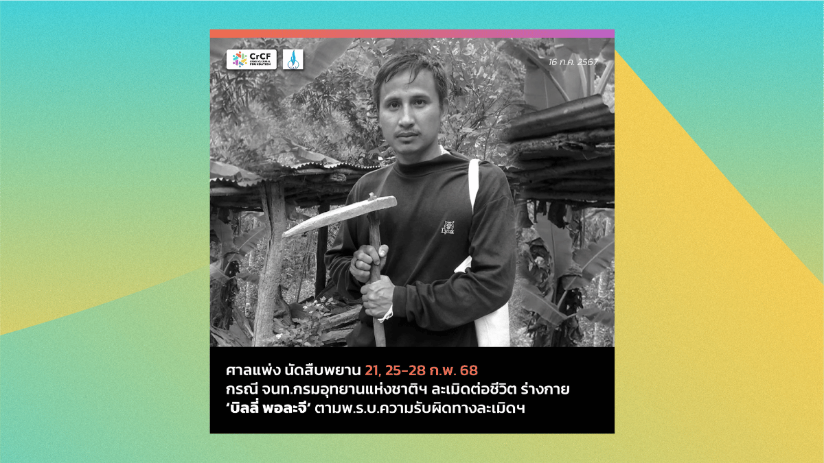 ศาลแพ่ง นัดสืบพยาน 21, 25-28 ก.พ. 68 กรณีเจ้าหน้าที่กรมอุทยานแห่งชาติฯ ละเมิดต่อชีวิต ร่างกาย บิลลี่ พอละจี รักจงเจริญ ตามพ.ร.บ.ความรับผิดทางละเมิดฯ 16 กรกฎาคม, 2024
