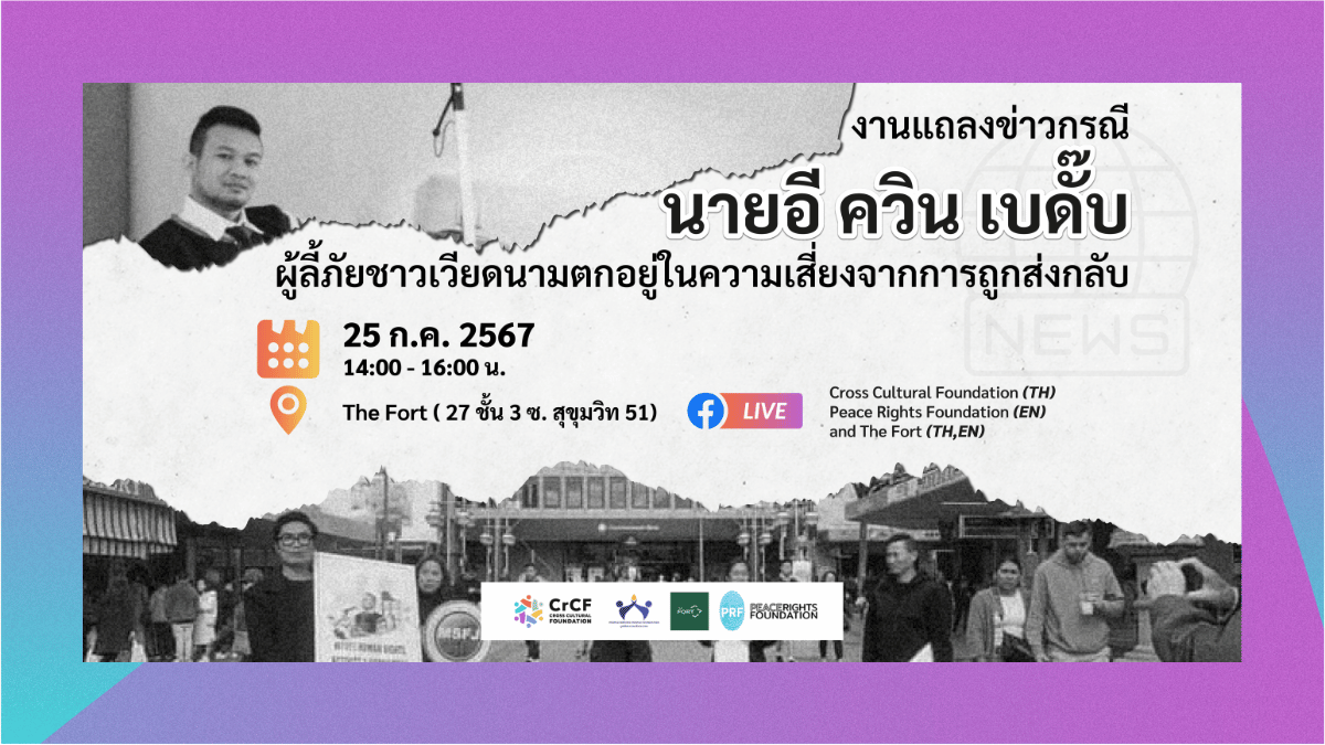 “งานแถลงข่าวกรณีนายอี ควิน เบดั๊บ ผู้ลี้ภัยชาวเวียดนามตกอยู่ในความเสี่ยงจากการถูกส่งกลับ” 25 กรกฎาคม 2567 14.00-16.00 น. The Fort (27 ซอยสุขุมวิท 51) 24 กรกฎาคม, 2024