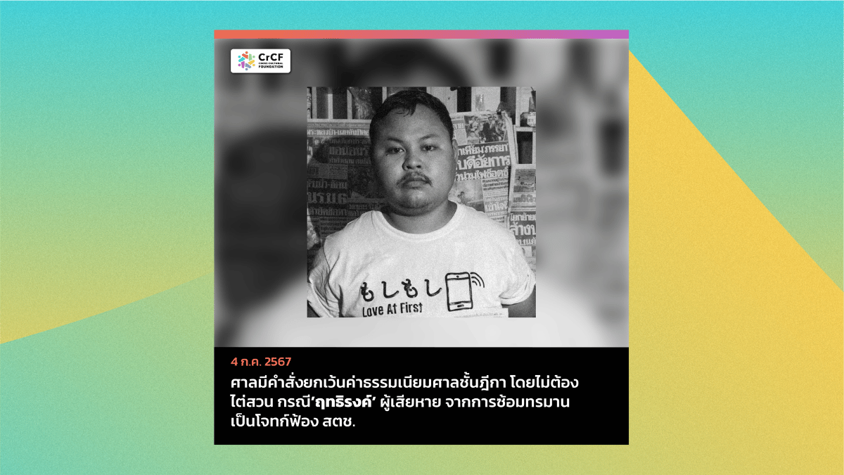 ศาลมีคำสั่งยกเว้นค่าธรรมเนียมศาลชั้นฎีกาโดยไม่ต้องไต่สวนกรณีฤทธิรงค์ ชื่นจิตร ผู้เสียหายจากการซ้อมทรมานเป็นโจทก์ฟ้อง สตช. 4 กรกฎาคม, 2024