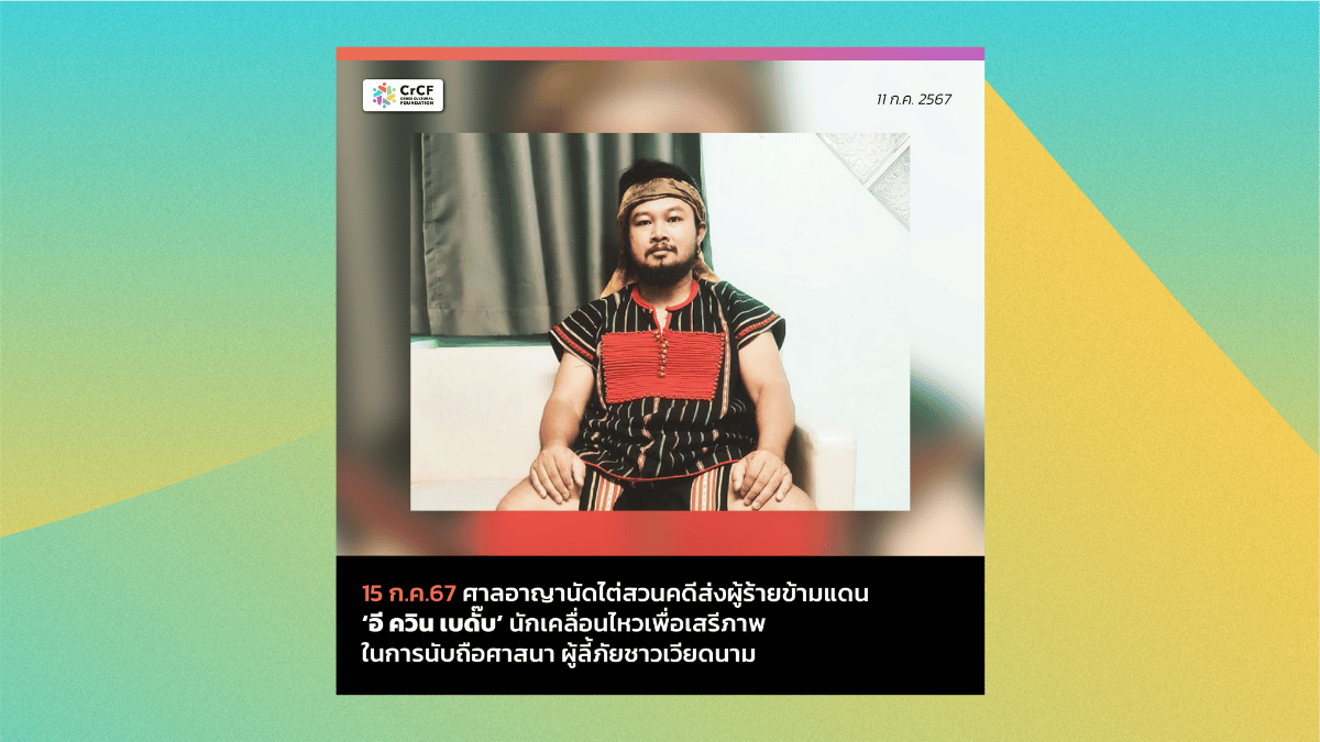 ผสานวัฒนธรรมร่วมเครือข่ายองค์กรสิทธิฯ จัดงานแถลงข่าว “กรณีนายอี ควิน เบดั๊บ ผู้ลี้ภัยชาวเวียดนามและนักเคลื่อนไหวเพื่อเสรีภาพในการนับถือศาสนาในกลุ่มชาติพันธุ์ตกอยู่ในความเสี่ยงจากการถูกส่งกลับ” 2 สิงหาคม, 2024