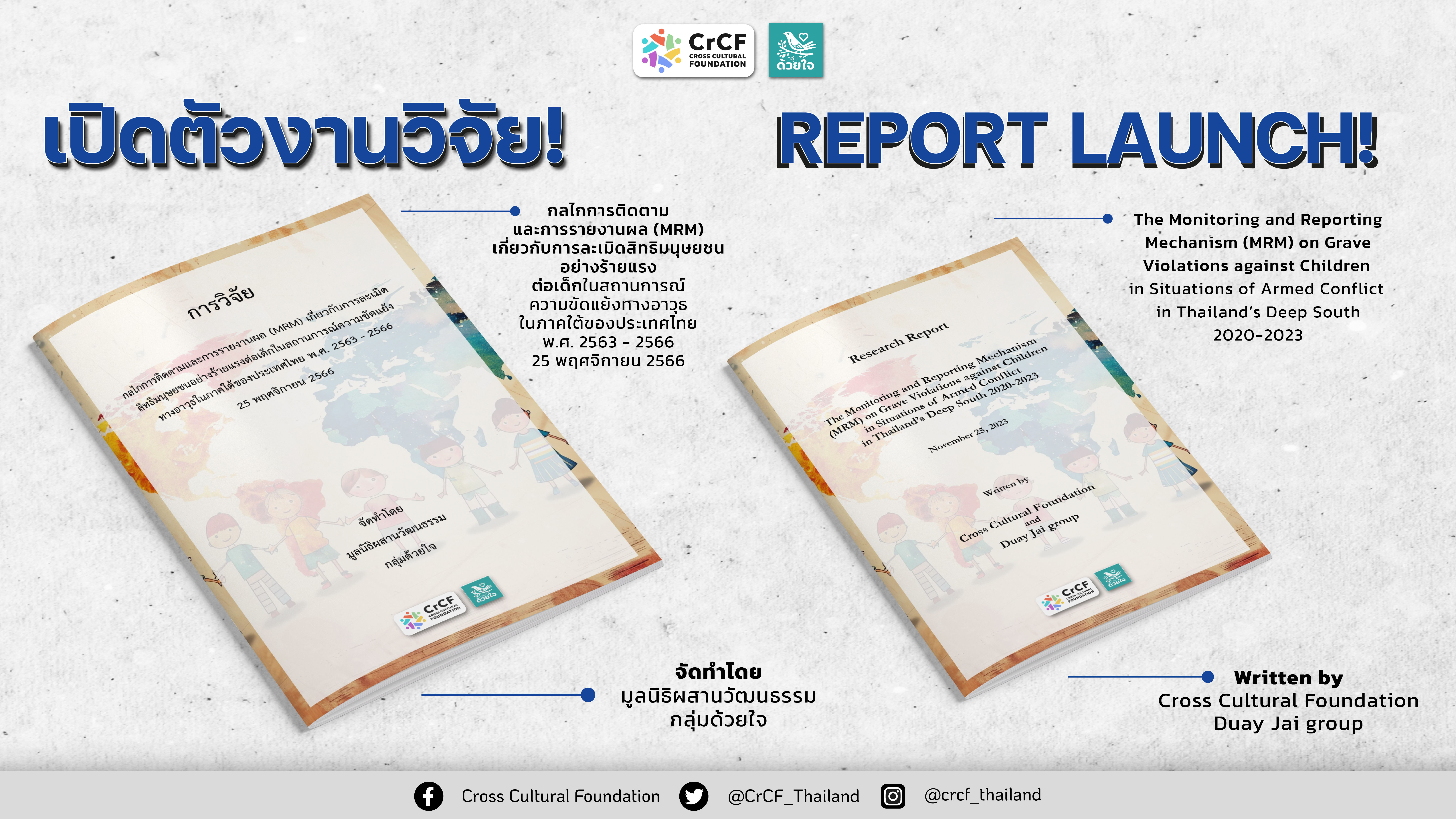 งานวิจัย “กลไกการติดตามและการรายงานผล (MRM) เกี่ยวกับการละเมิดสิทธิมนุษยชนอย่างร้ายแรงต่อเด็กในสถานการณ์ความขัดแย้งทางอาวุธในภาคใต้ของประเทศไทย พ.ศ. 2563 – 2566” (ฉบับภาษาไทยและฉบับภาษาอังกฤษ) โดยมูลนิธิผสานวัฒนธรรม และกลุ่มด้วยใจ Duayjai Group 5 กรกฎาคม, 2024