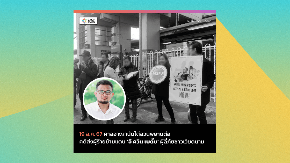 19 ส.ค.67 ศาลอาญานัดไต่สวนพยานต่อ คดีส่งผู้ร้ายข้ามแดน ‘อี ควิน เบดั๊บ’ ผู้ลี้ภัยชาวเวียดนาม 16 สิงหาคม, 2024