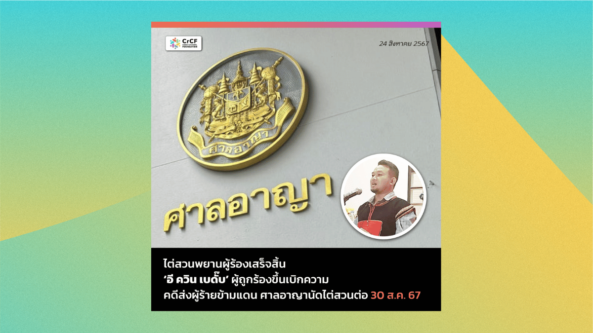 ไต่สวนพยานผู้ร้อง 2 ปากเสร็จสิ้น นัดไต่สวนต่อ 19 ส.ค. คดีส่งผู้ร้ายข้ามแดน ‘อี ควิน เบดั๊บ’ ผู้ลี้ภัยชาวเวียดนามนักเคลื่อนไหวเพื่อเสรีภาพในการนับถือศาสนา 6 สิงหาคม, 2024